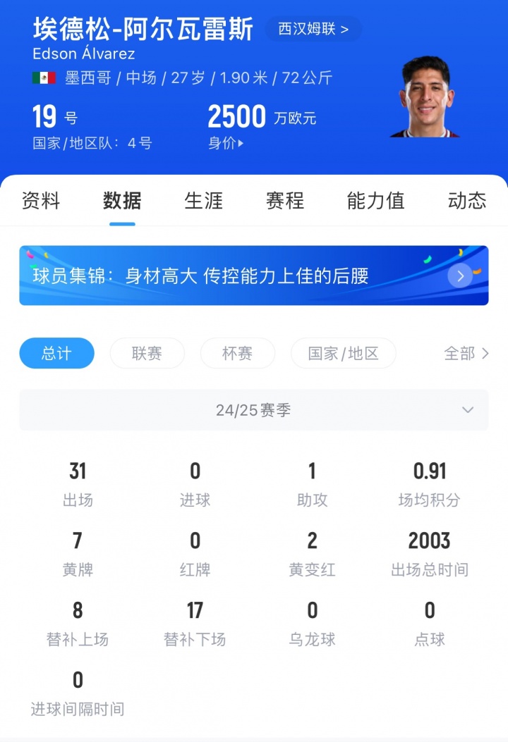 埃德松-阿尔瓦雷斯现年27岁,司职防守型中场,上赛季出战31场比赛,送出1记助攻,德转身价2500万欧元。