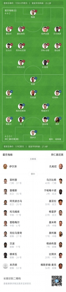 霍芬海姆首发:1-鲍曼、2-赫拉纳克、13-贝尔纳多、34-曹法尔、21-哈伊达里、7-阿夫杜拉胡、10-达马尔、18-沃特-博格、22-普拉斯、11-芬斯尼克-阿斯拉尼、29-B-图雷