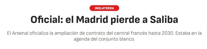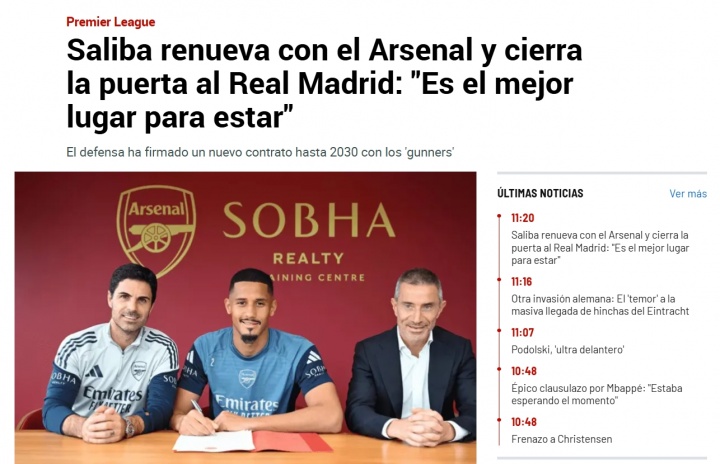 《阿斯报》的题目则是《官方:皇马错过萨利巴,阿森纳官宣与法国中卫续约至2030年,这名球员原本在皇马的引援计划中》